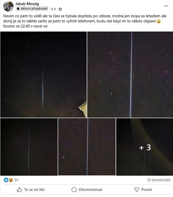 El inusual fenómeno fue observado por muchas personas el lunes 26 de agosto alrededor de las 22:40, incluyendo a Jakub Mossig, de Nová Ves. Compartió sus fotos en el grupo M?j Kolín. «No sé qué vi, pero la línea avanzaba por el cielo. Quizás solo era el rastro de un avión, pero es extraño que brillara así. Le tomé una foto con mi teléfono», escribió.