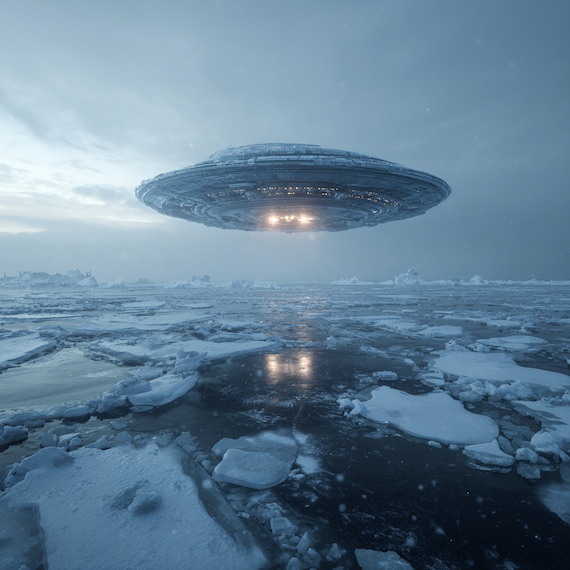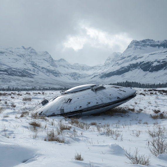 UFO flying over a frigid, icy sea. --v 7 Job ID: 5227e3c7-501c-4123-b2d9-427dcb1e69e6En junio de 1952, un escuadrón de seis aviones a reacción noruegos acababa de iniciar maniobras de verano sobre Spitsbergen. Mientras sobrevolaban el estrecho de Hinlopen, sus radios comenzaron a chisporrotear y a emitir estática antes de apagarse por completo, dejándolos sin posibilidad de comunicación. Mientras tanto, el radar mostraba la rápida aproximación de un objeto no identificado, pero los pilotos no podían ver nada visualmente. Los cazas sobrevolaron la zona durante un rato, cuando el capitán Olaf Larsen, supuestamente, miró hacia abajo y vio un disco metálico incrustado en el paisaje nevado, de entre 40 y 50 metros de diámetro, lo suficientemente brillante como para destacar en el paisaje nevado. Una inspección más detallada revelaría que se podía ver maquinaria y cables, así como una serie de reactores a un lado y lo que parecía ser una cabina rota que sobresalía del suelo helado. Cuando finalmente pudieron regresar a la base e informar lo que habían encontrado, se envió una expedición al aparente lugar del accidente, y un informe en el periódico alemán, Saarbrücker Zeitung, diría lo que se encontró: