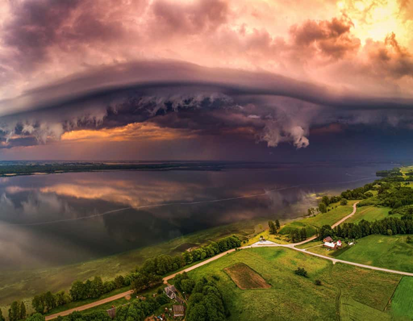 Esta foto de una tormenta con un arco al frente fue tomada por un dron en el lago Dusia, Lituania, el 11 de junio de 2020. El arco anuncia la llegada inminente de fenómenos violentos. Se manifiesta en forma de un rollo horizontal y denso, con bordes más o menos deshilachados. Los arcos más dentados generalmente generan…vientos muy violentos antes de la tormenta.