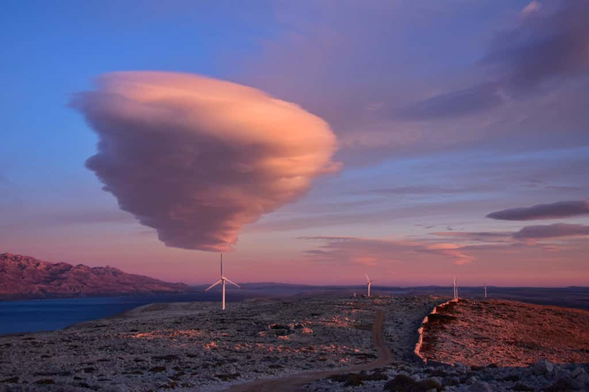 Esta nube lenticular triangular parece sacada de una película de ciencia ficción. Fue tomada en la isla de Pag, Croacia, el 6 de febrero de 2020. Es una nube ondulatoria que se forma cerca de las montañas.