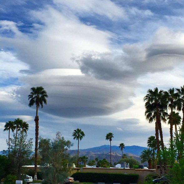 Cuando trabajaba en Los Ángeles, mi colega Kim Baldonado me envió esta impresionante foto de una nube lenticular sobre las montañas cerca de Palm Springs, California. Es fácil entender por qué la gente bromea diciendo que parecen platillos voladores. ¡Esta parece sacada de una película de ciencia ficción!