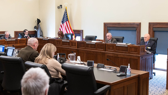 En una audiencia de asignaciones el viernes, el ayudante general de Wyoming, Greg Porter, respondió a una pregunta del presidente del Comité del Senado, Tim Salazar, sobre los ovnis en Wyoming. Porter dijo que prefería no hablar de ovnis en su testimonio público. (Matt Idler para Cowboy State Daily)
