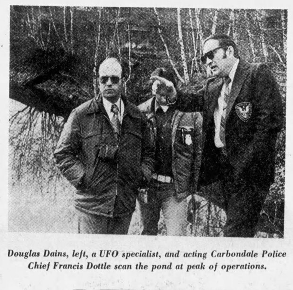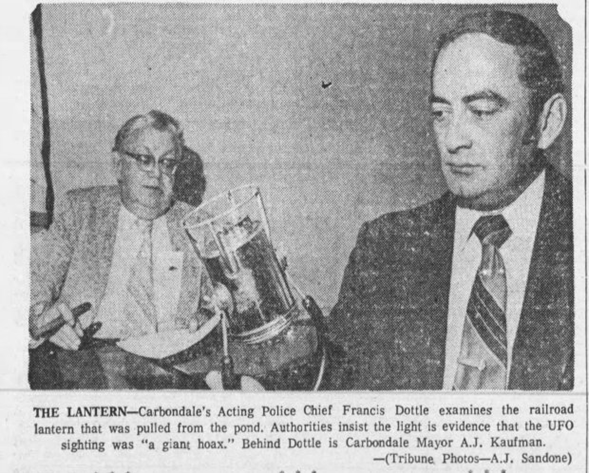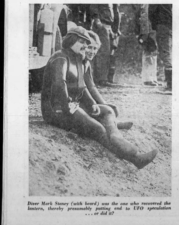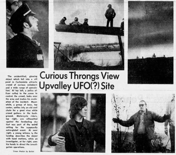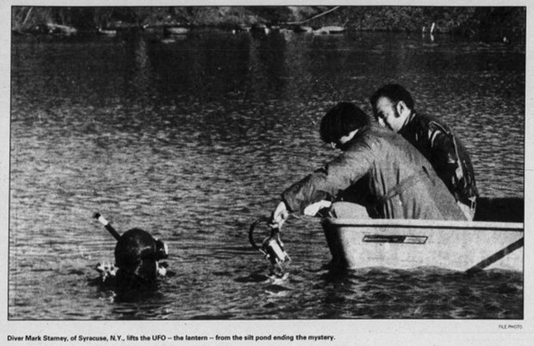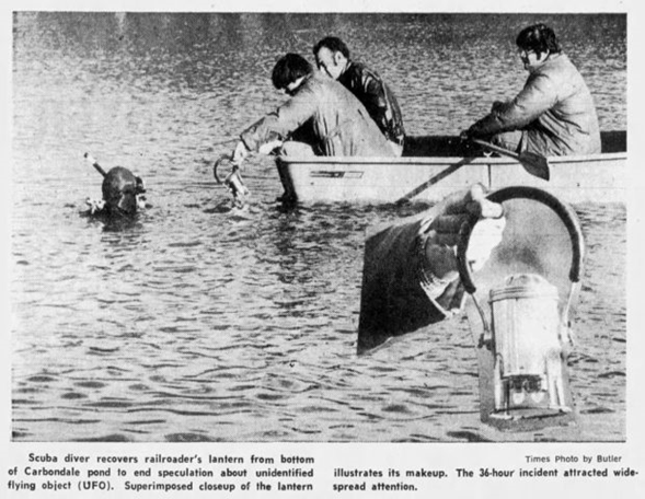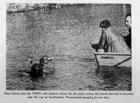 «»No es oro todo lo que reluce» es un viejo refrán. Del mismo modo, no es un platillo volante todo lo que reluce», escribió un reportero del Scranton Times en la edición del martes 12 de noviembre de 1974. «Esta realidad se hizo patente el lunes por la tarde en Carbondale, cuando la mano de un buzo emergió de las turbias aguas de un estanque de sedimentos detrás de Russell Park, aferrada a una linterna de ferrocarril eléctrica».