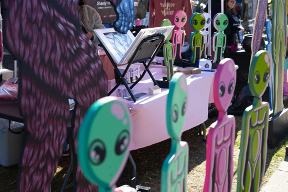 La calle principal permanecerá cerrada entre las avenidas Séptima y Salem para el «Mercado Landing Pad», que contará con unos 50 vendedores, artistas, artesanos y camiones de comida, según informó Curtis. Los adultos podrán disfrutar de bebidas de bodegas, una destilería, una sidrería y una hidromielería; además, habrá un recorrido artístico con temática alienígena, música en vivo y demostraciones de pintura en vivo a cargo de los artistas Eric Bussart y Zach Yahn, cuyos murales decoran el centro de la ciudad.