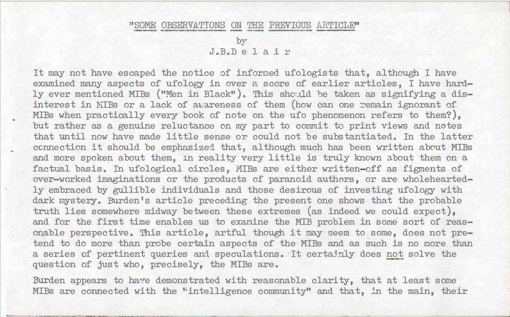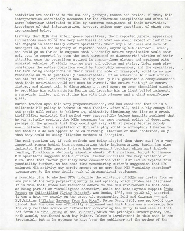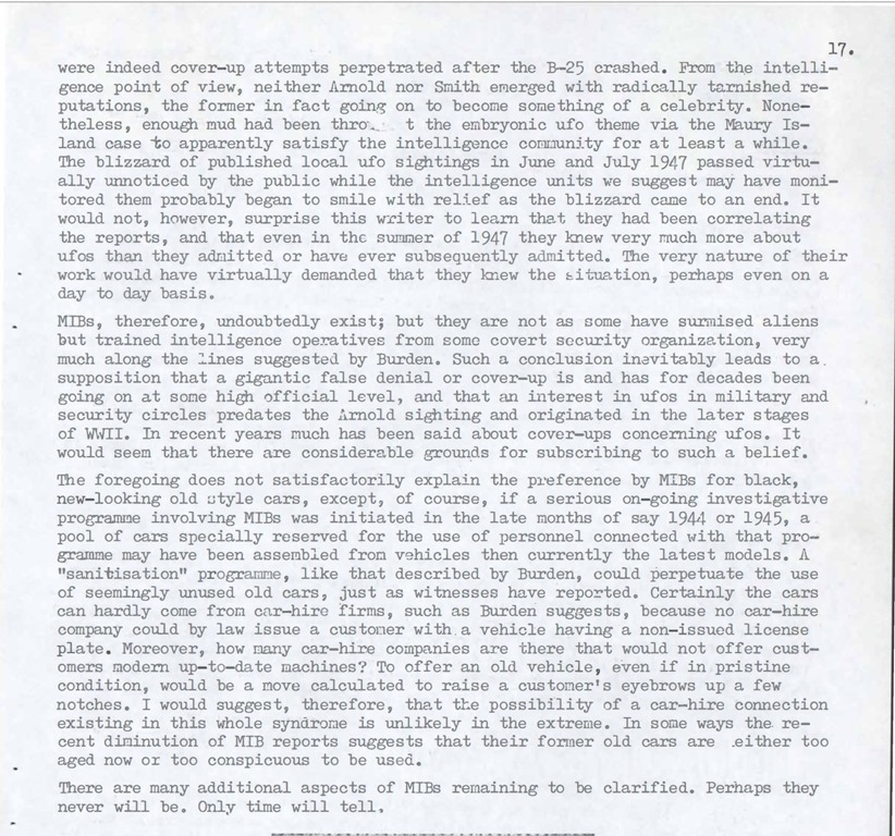 Por lo tanto, los MIBs, sin duda, existen; pero no son, como algunos han supuesto, alienígenas, sino operativos de inteligencia entrenados de alguna organización de seguridad encubierta, muy en línea con lo sugerido por Burden. Tal conclusión conduce inevitablemente a la suposición de que un gigantesco falso desmentido o encubrimiento está y ha estado ocurriendo durante décadas a algún alto nivel oficial, y que el interés en los ovnis en los círculos militares y de seguridad es anterior al avistamiento de Arnold y se originó en las últimas etapas de la Segunda Guerra Mundial. En años recientes se ha hablado mucho sobre encubrimientos relacionados con ovnis. Parecería que hay bases considerables para suscribir tal creencia.