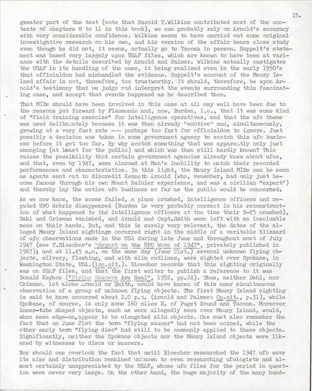 la mayor parte del texto (tenga en cuenta que Harold T. Wilkins contribuyó a la mayor parte del contenido de los capítulos 8 a 11 en este libro), probablemente nos basemos en la versión del caso de Arnold con una confianza considerable. Wilkins parece haber llevado a cabo algunas investigaciones propias originales, y su versión de los acontecimientos merece un estudio detallado a pesar de que él, al parecer, no fue en persona a Tacoma. La declaración de Ruppelt se basó en gran medida en los archivos de la USAF, los cuales se sabe que estaban en desacuerdo con los detalles descritos por Arnold y Palmer. De hecho, Wilkins critica duramente a la USAF por su manejo del caso, ya que incluso a principios de la década de 1950 se reconoció que el oficialismo había manejado mal la evidencia. El relato de Ruppelt del caso de la Isla Maury no es, por lo tanto, demasiado verídico. Debería, por lo tanto, deberíamos basarnos en el testimonio de Arnold para juzgar e interpretar los acontecimientos que rodearon este fascinante caso, y aceptar que los hechos ocurrieron tal como él los describió.»
