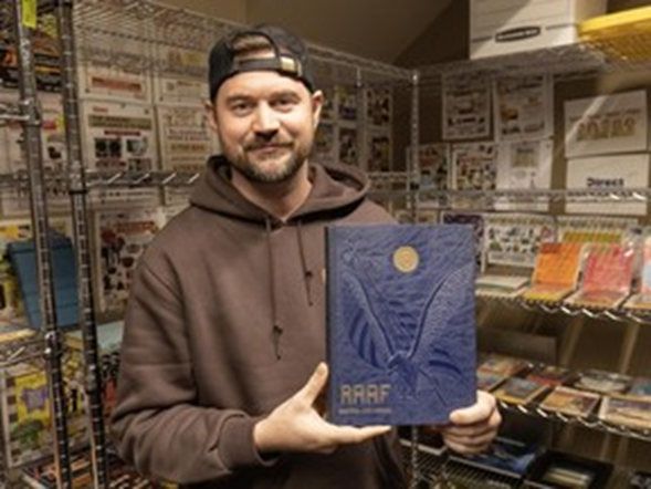 Mike McCune con un anuario de la base aérea de Roswell de 1947. El anuario corresponde al año en que, según los entusiastas de los ovnis, una nave espacial extraterrestre se estrelló cerca de Roswell. Forma parte de los objetos de colección relacionados con ovnis que Direct Liquidation subastará en Vancouver. Foto de Arlen Redekop / PNG