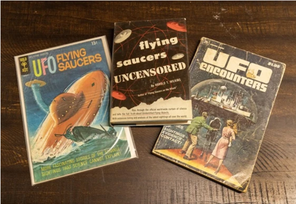 Revisar la colección es como tomar un curso intensivo de ufología. Hay docenas de libros y revistas sobre ovnis, desde un libro de bolsillo de 1950 titulado «Los platillos voladores son reales» de Donald Keyhoe hasta el libro de 1998 «Los extraterrestres y el bisturí: Prueba científica de implantes extraterrestres en humanos» del Dr. Roger K. Leir.