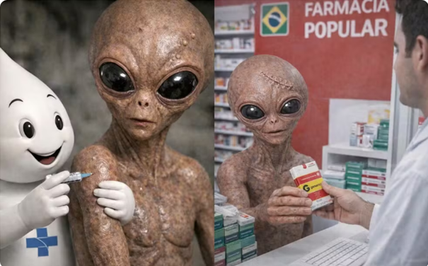En las imágenes producidas con humor, el extraterrestre aparece sosteniendo una tarjeta del SUS (sistema público de salud brasileño), siendo vacunado por el personaje Zé Gotinha (personaje que representa las campañas de vacunación), recogiendo medicamentos en una farmacia pública, recibiendo atención del SAMU (servicio médico de emergencia), haciendo una consulta odontológica y siendo examinado por un especialista.