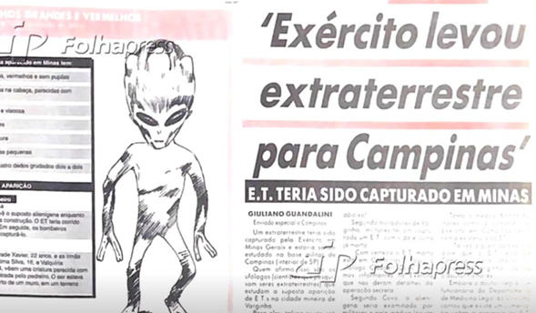 El documental ‘El Misterio de Varginha’ reproduce un periódico de la época que abordó el supuesto envío de un extraterrestre a la Unicamp en 1996 — Foto: Reproducción/TV Globo