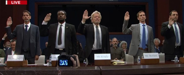 El reportero de investigación de 8 News Now, George Knapp, junto con otros cuatro testigos, testifica ante un comité del Congreso sobre FANI, también conocidos como ovnis, el 9 de septiembre de 2025. (Video compartido durante la audiencia del comité)