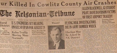 Ese día, el Tacoma Times titulaba «Se insinúa sabotaje en el accidente de un bombardero del Ejército en Kelso» y un subtitular decía «Avión podría guardar el secreto de un disco volador». Escrito por Paul Lance, el artículo afirmaba que el avión había sido saboteado o derribado para impedir el envío de fragmentos de discos voladores a Hamilton Field, California, para su análisis.