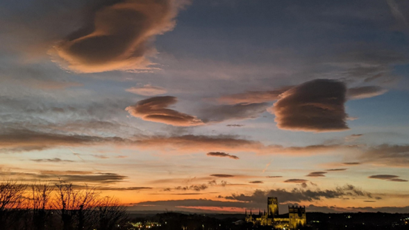 Fuente de la imagen,BBC WeatherWatcher / Cockney del norte. ‘Platillos voladores’ sobrevuelan la Catedral de Durham el viernes por la mañana