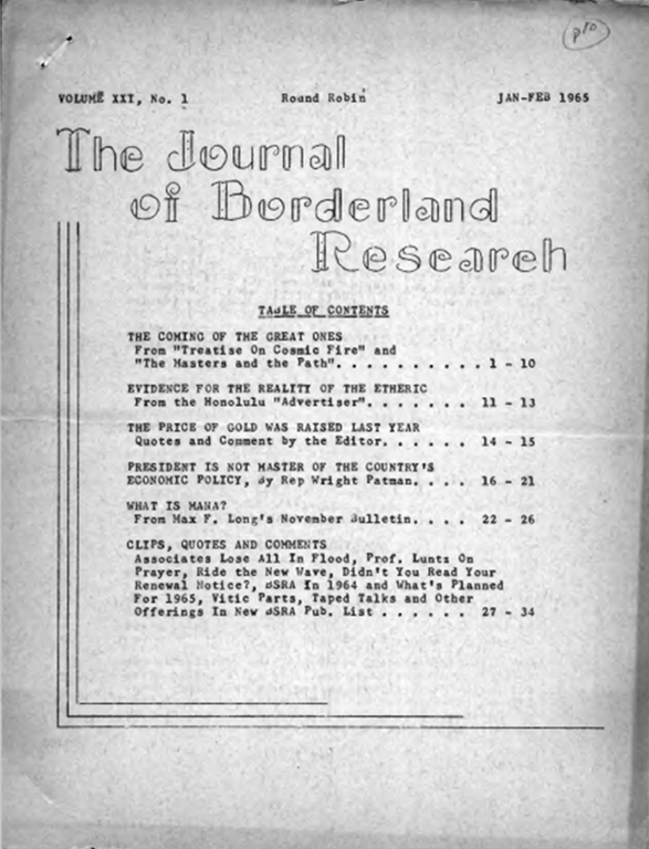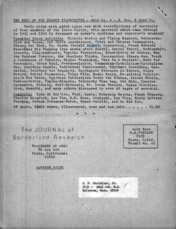 Considera estos temas: Mundos etéricos y platillos volantes, Reencarnación y karma, la Hermandad Blanca, el Tíbet y los comunistas chinos, Chiang Kai-shek, el Dr. Kappa (Gerald Light), la concepción, Frank Edwards describe su fallecimiento (dos semanas después de su muerte), el viaje astral, la mediumnidad, los aportes, la clariaudiencia, la protección psíquica, la sensibilidad del genio, El hombre, el creador supremo, el Absoluto piensa, la encarnación siempre nueva, la verdad como consenso de opiniones, el pesimismo superior, ¿qué es un error?, la necesidad de la necesidad, el alma grupal, la superpoblación, comunismo-catolicismo-capitalismo-guerra, los ángeles de la guarda, la superación personal, la respiración rítmica, el kundalini, el celibato no es obligatorio, tensiones sísmicas en los éteres, las estrellas giran, Formación en espiral, inversión polar, estrellas de radio, desalinización del agua de mar de California, iniciaciones egipcias bajo la esfinge, caparazones astrales, radioactividad, psicoquinesis, retraso temporal en la telepatía, el halo, el aurametro de Cameron, radiestesia, autohipnosis, terapia del Dr. Drown, civilización maya, samadhi, y muchos otros temas tratados en más de 60 páginas de material.