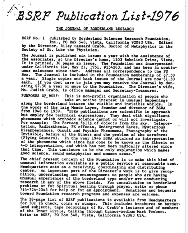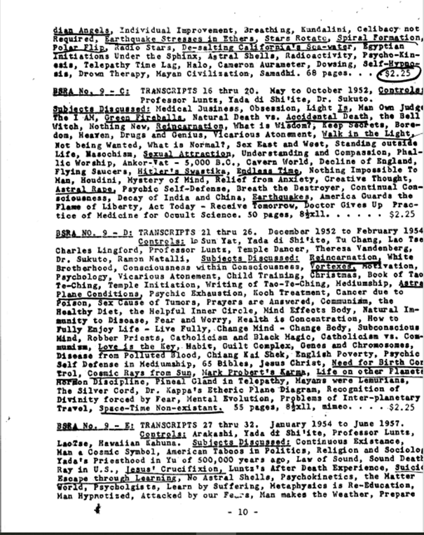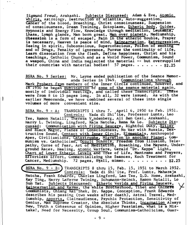 Controles: Yada di Shi’ite, profesor Luntz, Lao Tse, Ramón Natalli, Theresa Vandenberg, Ali Ben Casi, Arakashi, Harry L. Twining, Lingford, Raja Natcha, Rama Ka Lo. Temas tratados: Comunicación con platillos volantes, Deber legítimo, Hitler y la magia negra, Planos de conciencia, No a la guerra con Rusia, Sonido destructivo, Contacto con el Círculo Interno, Elementales, Simios antropoides, Civilizaciones, Catástrofe. Migración a otro planeta, Comunismo frente a catolicismo, Escuelas ocultistas, Liberación de la ilusión, Telepatía, La maldición del miedo, El arte de la meditación, Respiración, los mayas, razas subterráneas, sanación, guerra atómica, Gerald «Dr. Kappa» Light, gráfico de los niveles etéricos inferiores y el árbol de la vida, mantras y oraciones, esfuerzo sin esfuerzo, comercialización de las sesiones de espiritismo, tratamiento de Koch para el cáncer, mediumnidad. 72 páginas, 8 1/2 x 11, mimeografía. . .$ 2,25