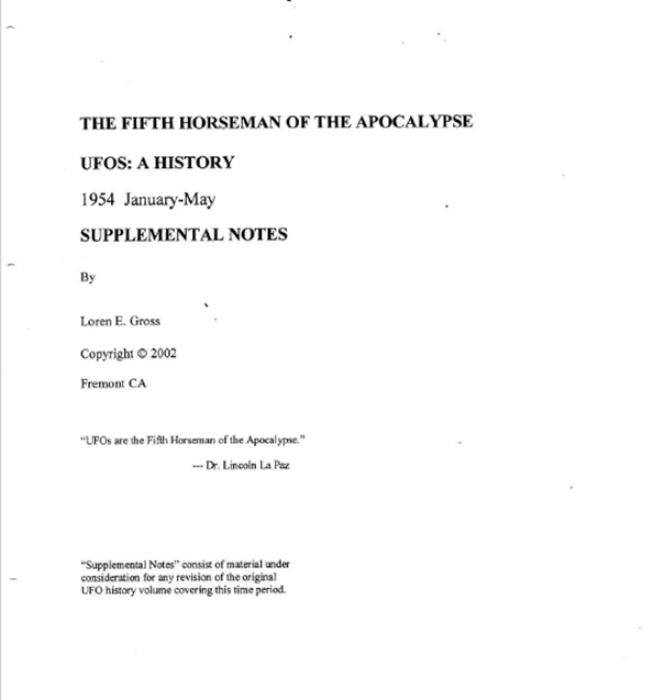 Loren E. Gross, The Fifth Horseman of the Apocalypse. UFOs: A History. 1954 January-May. Supplemental Notes, Fremont CA, 2002. Pag 29.