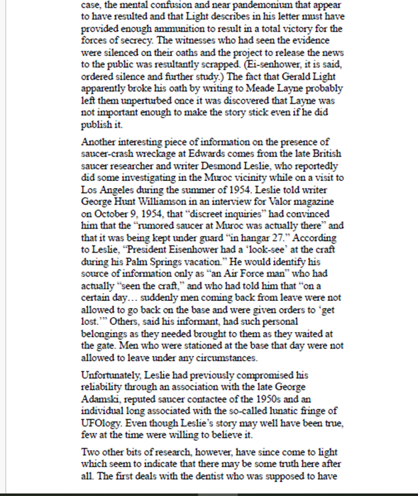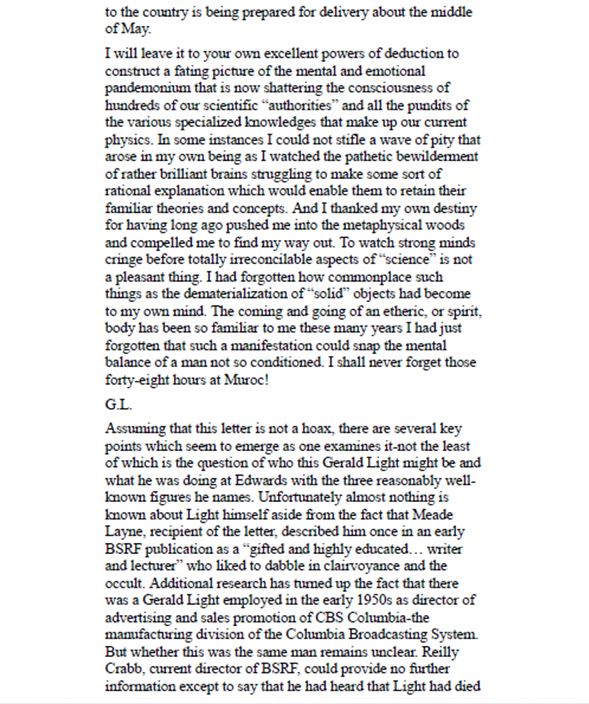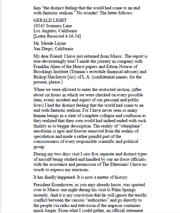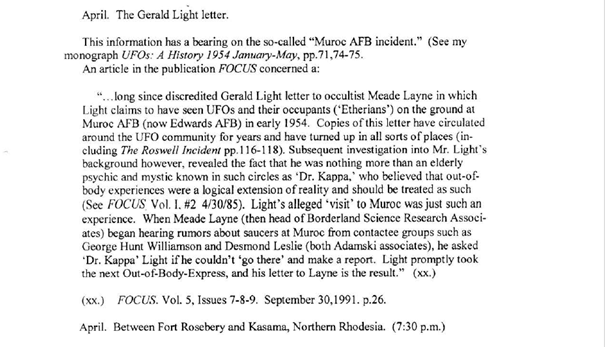 «… carta de Gerald Light, desacreditada hace tiempo, dirigida al ocultista Meade Layne, en la que Light afirma haber visto ovnis y a sus ocupantes («etherianos») en tierra en la base aérea de Muroc (ahora base aérea de Edwards) a principios de 1954. Copias de esta carta han circulado por la comunidad ovni durante años y han aparecido en todo tipo de lugares (incluido The Roswell Incident, pp. 116-118). Sin embargo, una investigación posterior sobre los antecedentes del Sr. Light reveló que no era más que un anciano psíquico y místico conocido en esos círculos como el «Dr. Kappa», quien creía que las experiencias extracorporales eran una extensión lógica de la realidad y debían tratarse como tal (véase FOCUS, vol. I, n.º 2, 30/4/85). La supuesta «visita» de Light a Muroc fue precisamente una experiencia de ese tipo. Cuando Meade Layne (entonces director de Borderland Science Research Associates) comenzó a oír rumores sobre platillos volantes en Muroc procedentes de grupos de contactados como George Hunt Williamson y Desmond Leslie (ambos asociados de Adamski), le preguntó al «Dr. Kappa» Light si no podía «ir allí» y elaborar un informe. Light tomó sin demora el siguiente Out-of-Body-Express, y su carta a Layne es el resultado.» (xx.)