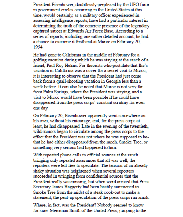 Había viajado a California a mediados de febrero para unas vacaciones de golf, durante las cuales se alojaba en el rancho de un amigo, Paul Roy Helms. Para los teóricos que postulan que las vacaciones de Ike en California fueron una tapadera para una visita secreta a Muroc, resulta interesante observar que el presidente acababa de regresar de unas vacaciones de caza de codornices en Georgia menos de una semana antes. También cabe señalar que Muroc no está muy lejos de Palm Springs, donde se alojaba el presidente, y una visita a Muroc habría sido posible si hubiera podido desaparecer del escrutinio constante de la prensa aunque fuera por un solo día.