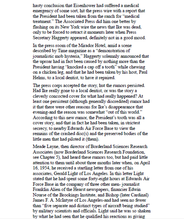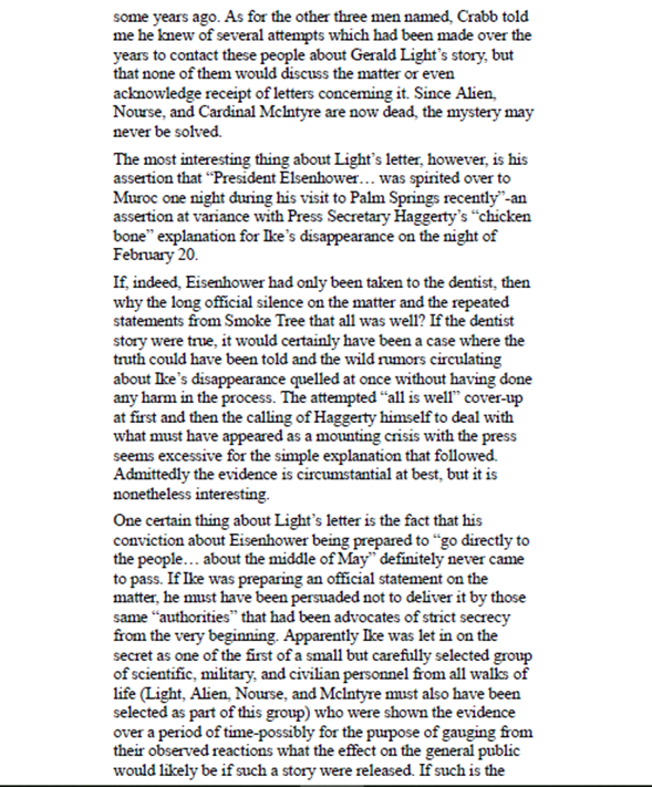 Una cosa es segura sobre la carta de Light: su convicción de que Eisenhower estaba dispuesto a «dirigirse directamente al pueblo… a mediados de mayo» definitivamente nunca se materializó. Si Ike estaba preparando una declaración oficial al respecto, debió de ser persuadido para no pronunciarla por esas mismas «autoridades» que habían defendido el secreto estricto desde el principio. Al parecer, a Ike se le reveló el secreto como uno de los primeros de un pequeño pero cuidadosamente seleccionado grupo de personal científico, militar y civil de todos los ámbitos de la vida (Light, Alien, Nourse y McIntyre también debieron de haber sido seleccionados como parte de este grupo) a quienes se les mostraron las pruebas durante un periodo de tiempo —posiblemente con el propósito de evaluar, a partir de sus reacciones observadas, cuál sería el efecto probable en el público en general si se hiciera pública tal historia. Si tal es el imagecaso, la confusión mental y el casi caos que parecen haberse producido y que Light describe en su carta debieron de proporcionar munición suficiente para que las fuerzas del secretismo obtuvieran una victoria total. Los testigos que habían visto las pruebas fueron obligados a guardar silencio bajo juramento y, en consecuencia, se descartó el proyecto de hacer pública la noticia. (Se dice que Eisenhower ordenó el silencio y que se siguiera investigando.) El hecho de que Gerald Light aparentemente rompiera su juramento al escribir a Meade Layne probablemente no les inquietó demasiado, una vez que se descubrió que Layne no era lo suficientemente importante como para que la historia tuviera repercusión, aunque la publicara.