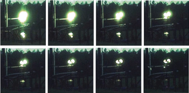 Una serie de ocho imágenes muestra dos luces brillantes. La luz superior flota sobre una placa de acero antes de disiparse. La luz inferior flota sobre un pino cortado antes de desvanecerse. Todo alrededor de las luces está oscuro. Martin Uman provocó un rayo que generó dos fenómenos simultáneos similares a centellas. En los primeros 112 ms del fenómeno, la esfera brillante superior (inicialmente de ~71 cm de ancho) flotó sobre una placa de acero, mientras que la esfera brillante inferior flotó sobre un tocón de pino recién cortado. Crédito: Dustin Hill/Scientific Lightning Solutions; Martin Uman y Doug Jordan/Universidad de Florida