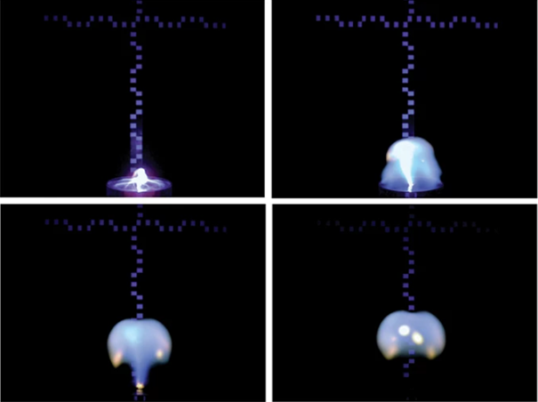 Cuatro imágenes muestran la generación de un plasma esférico. El fondo es negro con un patrón de puntos en forma de T. La primera imagen muestra el inicio de una chispa simimalr a un rayo, que crece en la segunda imagen y comienza a ser envuelta en lo que parece un gas blanco azulado. La sustancia comienza a parecer una bola con una cola en la tercera imagen y, luego, en la cuarta imagen, la sustancia se forma completamente en una bola con dos luces brillantes en su interior. En un experimento realizado por Ursel Fantz, se generan bolas de plasma descargando una corriente eléctrica justo debajo de una superficie acuosa (arriba a la izquierda y derecha). Cuando se apaga la corriente (abajo a la izquierda), el plasma asciende y forma una bola (abajo a la derecha). Crédito: Instituto Max Planck de Física del Plasma