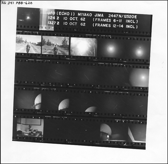 Registro oficial de la Fuerza Aérea de los EE. UU. tomando fotografías continuas de un «misterioso objeto luminoso (ECHO 1)» sobre la isla Miyako el 10 de octubre de 1962.