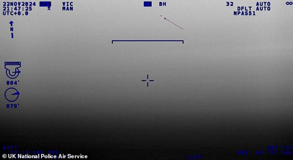 imageUna captura de pantalla del video del helicóptero obtenida por el Daily Mail muestra un pequeño objeto, que aparece como una diminuta mancha en la cámara infrarroja, moviéndose lentamente hacia la parte superior derecha de la pantalla.