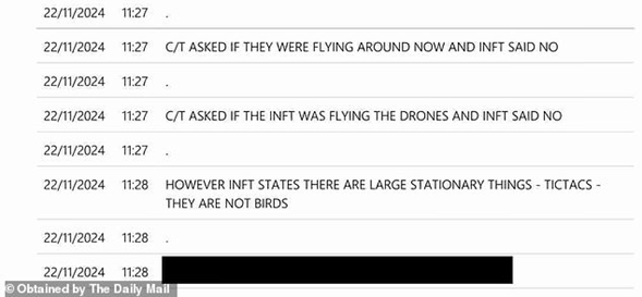 imageLos registros obtenidos por el Daily Mail muestran que un ‘informante’ describió lo que vio alrededor de la base aérea como ‘objetos grandes y fijos: tictacs’.