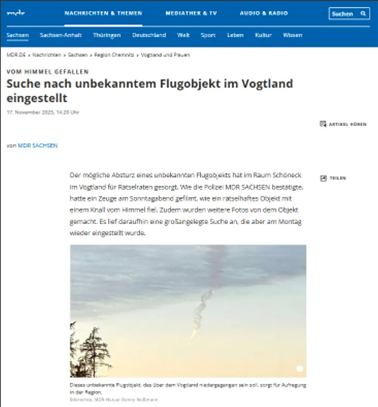 Según la emisora de radio alemana MDR Saxony, la policía local buscaba el posible accidente de un objeto volador no identificado (antes denominado ovni, ahora FANI) cerca de la frontera checa. Un testigo grabó el objeto cayendo del cielo cerca de Schöneck el domingo, y la policía alemana está investigando el video.