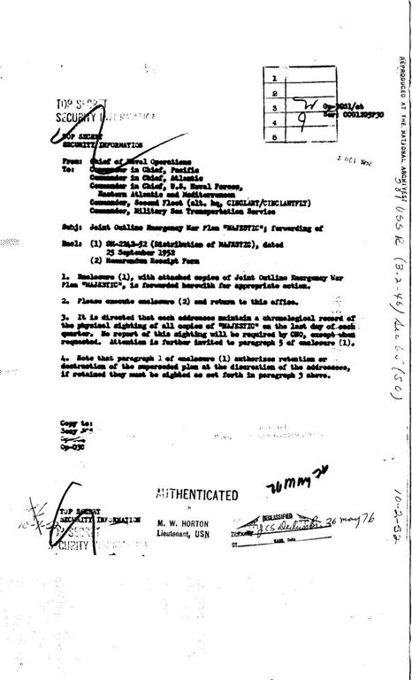 2befa8d3-3b70-469b-8800-0da9b9b0e572_1020x1680La tercera página contiene la lista de distribución del Jefe de Operaciones Navales, Almirante William M. Fechteler (USN). Se desconoce por qué las listas de distribución de los demás jefes de comando combatiente (General Hoyt Vandenberg (USAF), General Lemuel C. Shepherd Jr. (USMC) y General J. Lawton Collins (EE. UU.)) no se incluyen también en la desclasificación. Se mencionan los estrictos requisitos de presentación cronológica de informes para el avistamiento físico de los planes de guerra MAJESTIC el último día de cada trimestre.