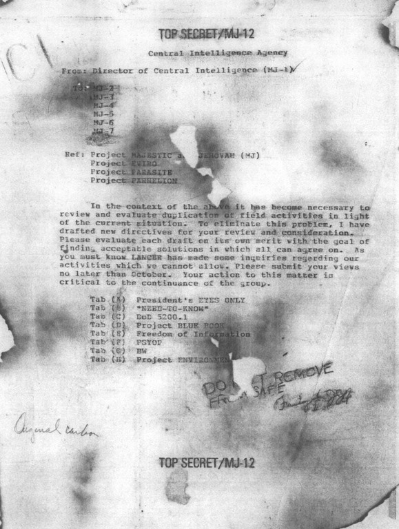1. Proyecto MAJESTIC y JEHOVAH: se cree que es un proyecto de ingeniería inversa de las naves recuperadas de varios accidentes. Posiblemente, un proyecto dividido entre los mecanismos de propulsión y control (MAJESTIC) y las teorías sobre el origen y las intenciones de las naves NHI (JEHOVAH).