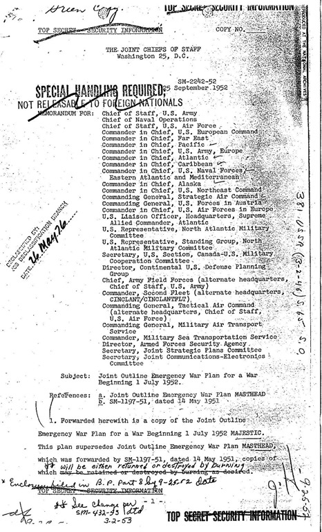Obsérvese que el JCS realizó dos modificaciones a los planes en dos ocasiones: el 25 de septiembre de 1952 y el 2 de marzo de 1953. Estas modificaciones pueden haber sido el resultado directo de la «Demostración de fuerza» realizada por los visitantes del NHI en los cielos de Washington, DC, entre el 12 y el 29 de julio de 1952.