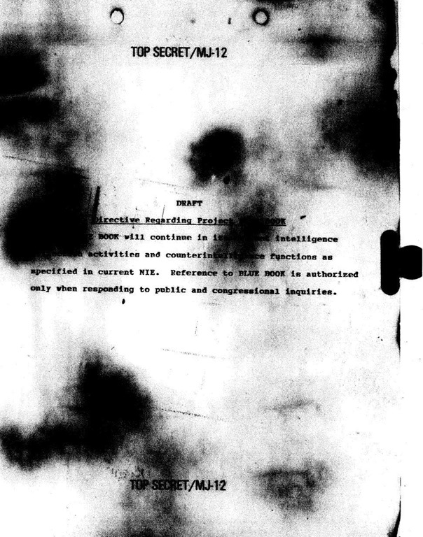 NIE (Estimación Nacional de Inteligencia). El padre del Proyecto LIBRO AZUL, el general de la Fuerza Aérea de los Estados Unidos, Charles P. Cabell, supervisó la ejecución de esta directiva como subdirector de la CIA en 1961. La función de contrainteligencia estuvo a cargo del Dr. J. Allen Hynek, quien minimizó todos los informes que recibía LIBRO AZUL, incluso cuando los informes eran de observadores creíbles.