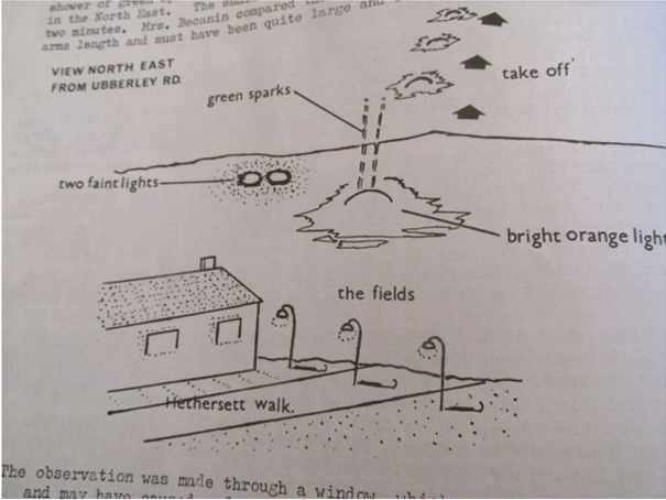 Por ejemplo, en Kidsgrove, en 1967, la Sra. Edna Moran había estado bromeando con una amiga sobre platillos voladores y refunfuñando que todo lo que se decía sobre ellos era pura tontería. Posteriormente, vio un objeto misterioso suspendido en el cielo, tras lo cual, como informó este periódico, dijo que «nunca más se reiría de ellos». Un mes después, una señora de Bucknall afirmó haber visto tres objetos misteriosos en unos campos cerca de la escuela secundaria Hanley que ascendieron antes de desaparecer.
