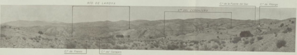 Figura 2: Vista panorámica de las tierras de Laroya afectadas por los incendios, extraída del informe sobre fenómenos geofísicos en Laroya (Almería) de junio de 1945 del geógrafo José Cubillo Fluiters (fuente: Obra derivada de Biblioteca del Instituto Geográfico Nacional, CC BY 4.0 ign.es).