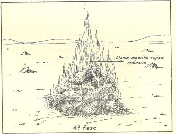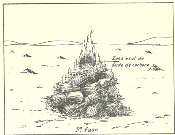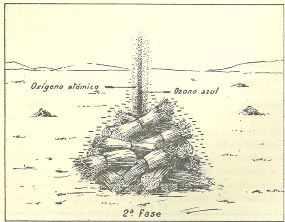 Fase 3: El oxígeno atómico producido por la doble acción eléctrica y adsortiva de la celulosa se combina con la celulosa, dando como resultado la combustión de una micela fina que sirve como cebo para propagar el fuego. El fuego se inicia en la pila con una llama azul, ya que la falta de oxígeno produce monóxido de carbono.