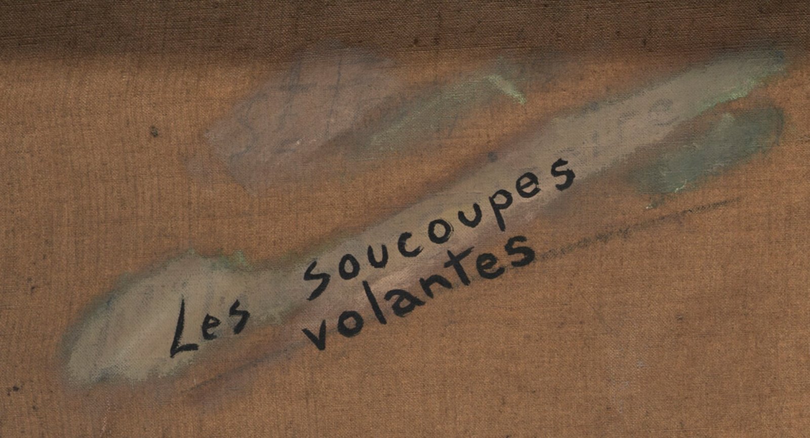 Esto es interesante, ya que el término «Platillo Volador» no parece haber sido usado antes de Kenneth Arnold en 1947. El cuadro lleva un título en el reverso, aparentemente escrito a mano por Trouille, pero también parece escrito sobre un título anterior. Quizás Trouille le cambió el título posteriormente.