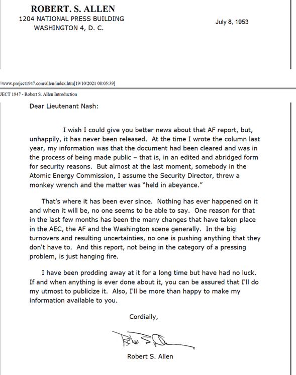 El famoso informe «Proyecto Saucer» del 27 de abril de 1949, resumen de las investigaciones realizadas por el Comando de Material Aéreo en Wright Field, contenía un relato del asunto de la isla Maury.